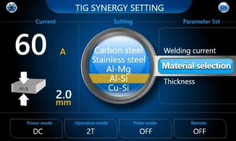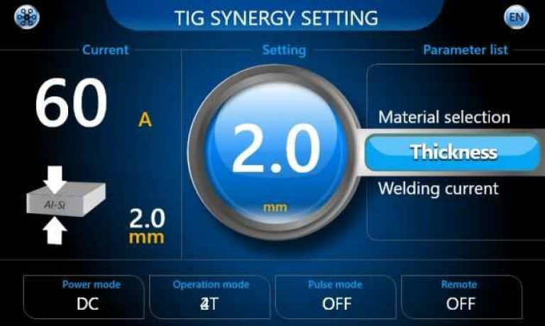 Az impulzus frekvencia digitális szabályozása teszi teljessé a paraméterezhetőségét az következő beálításoknak: Csúcsáram, Alapáram, Impulzus frekvencia és Impulzus szélesség. Ezzel kontrolálható a munkadarabba bevitt hőmennyiség a megfelelő beolvadás elérése érdekében, minimalizálva az anyag deformációjának mértékét, elérve az ideális egyensúlyt (balansz) az alumínium oxidtöréséhez.